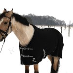Bei diesem Fotoshooting posiert Filou mit seiner neuen, schwarzen Abschwitzdecke auf der Koppel. Das „Z“ vorne auf der Decke steht für die Qualitätsmarke „Horze“. Wie man sieht, ist Filou glücklich und zufrieden mit seiner neuen Decke. 🙂 Kein Wunder, denn die Decke fühlt sich besonders weich an, ist augenscheinlich sehr gut verarbeitet und lässt sein Fell nach dem Training schnell trocknen.