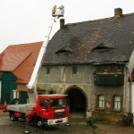 Letzte Woche wurden einige Ausbesserungsarbeiten am Torhausdach getätigt. Und da die Arbeitsbühne schon mal vor Ort war konnte ich nach Beendigung der Arbeiten zum Fotografieren 28m in den Himmel aufsteigen um den Reiterhof von oben abzulichten.